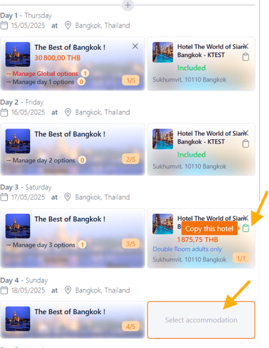 💡 You can copy/paste a hotel into the next day using the copy icon in the timeline — useful for multi-night stays.