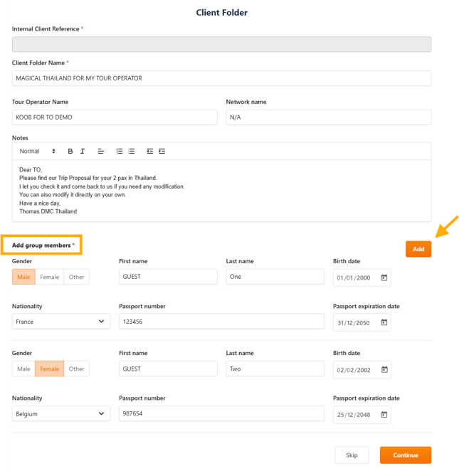 📌 If you don't have the TO's guests details, enter “Guest ONE” with a date of birth of 01/01/2000. The Tour Operator will be able to edit this information on its own when the client folder is opened.