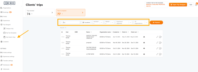 📁 Go to "My Client's Trips > Trips in Progress", and use the Proposal filter.