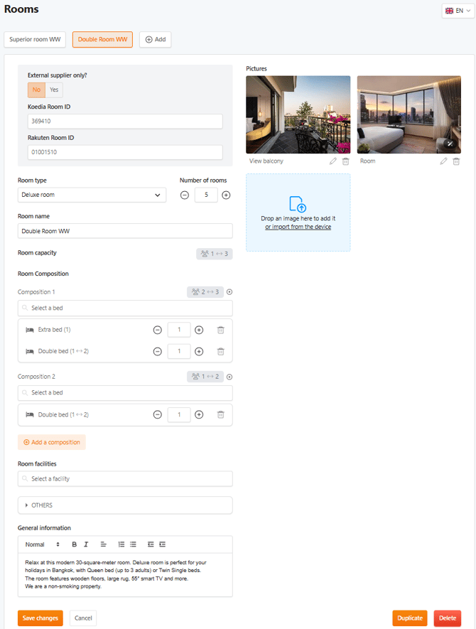 - Each room has detailed settings, including bed compositions, capacity, facilities, and descriptions.