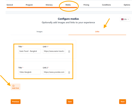 In the Links section, you can insert external content to support or promote your experience.