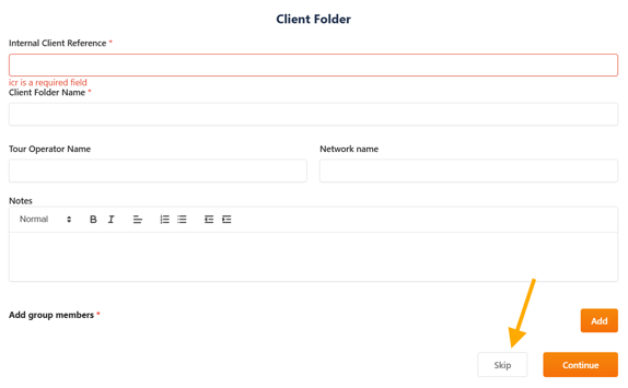 • Single Booking → Click "Skip" to proceed without linking to a client folder.