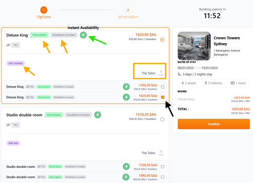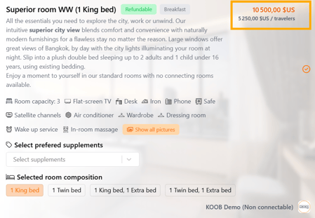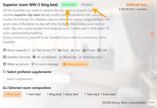 For each result, you will see the meal plan label (Room Only, Breakfast included...), the cancellation conditions label (Refundable, non-refundable), or the type of rate