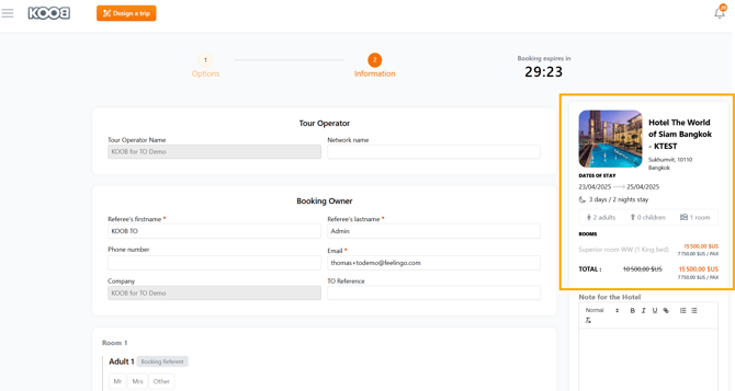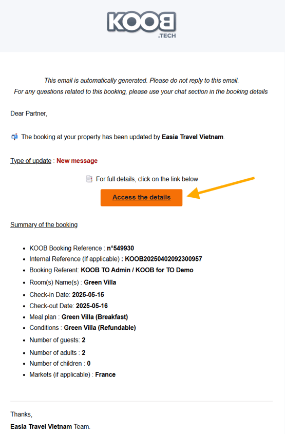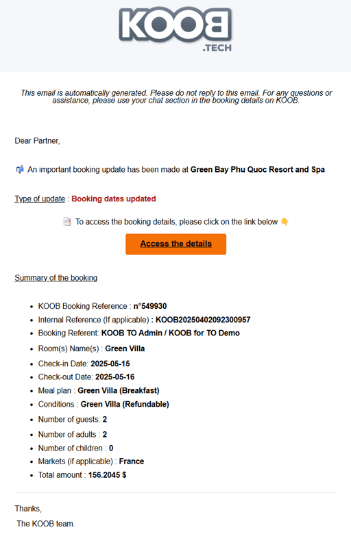 • KOOB automatically notifies the TO of the new update with a Booking Update email.