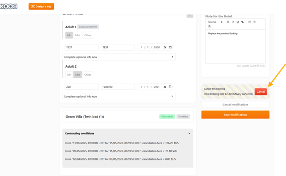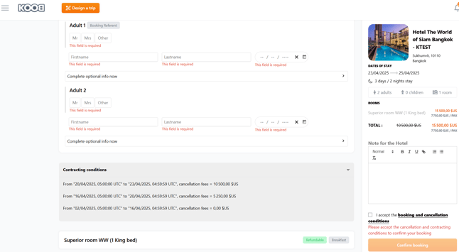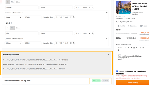 • Before validating, do not forget to confirm the Hotel conditions and the cancellation policy which are in the grey part under the clients information.