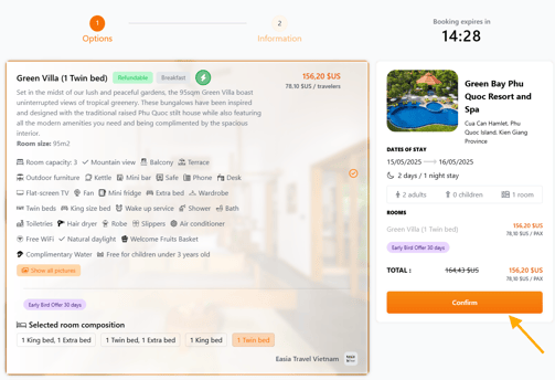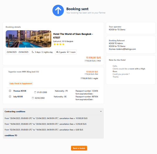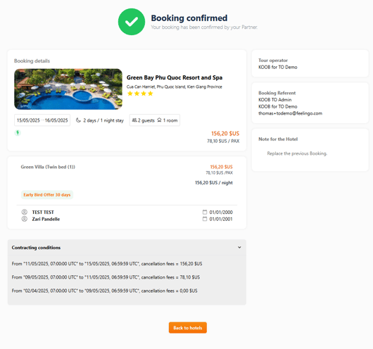Confirmed TO confirms the booking after a hotel’s proposal was accepted. Hotel + DMC Booking Confirmation
