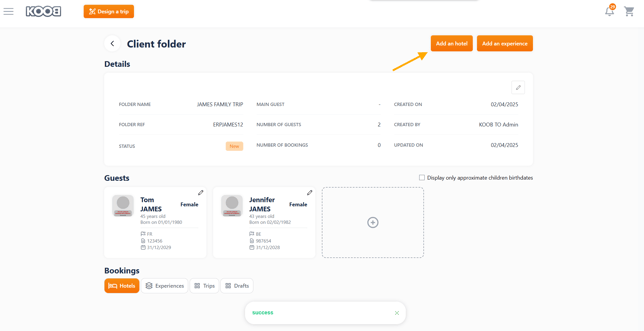 In this article, we explain how to book a hotel from scratch or via a Client Folder (the recommended method for better organization and group management).