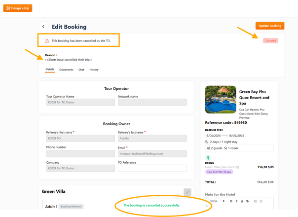 Cancelled Booking was cancelled by TO or by the DMC (following TO request via Chat). Hotel + DMC + TO Booking Cancelled