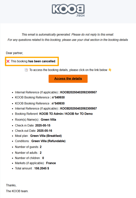 📧 No, KOOB sends an automated cancellation email to the hotel and DMC.