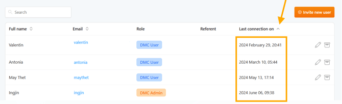 π Tip: Click on the arrow next to "Last connection on" to sort users by: