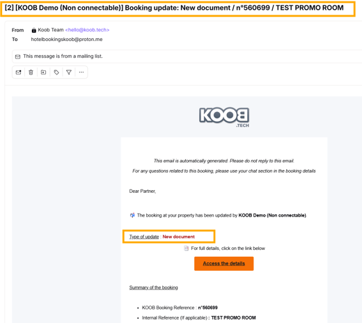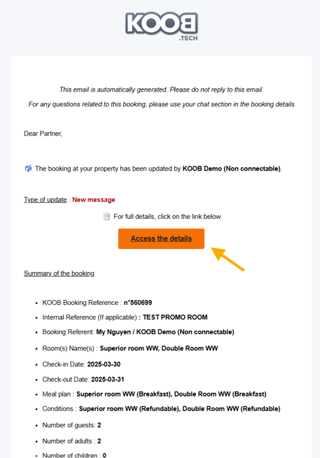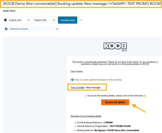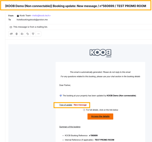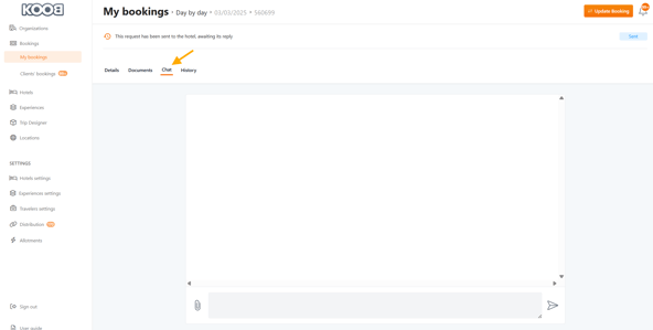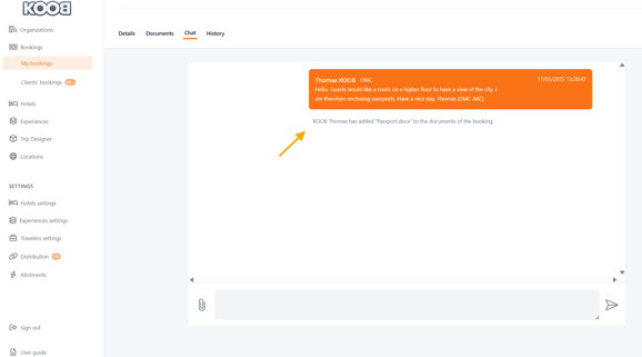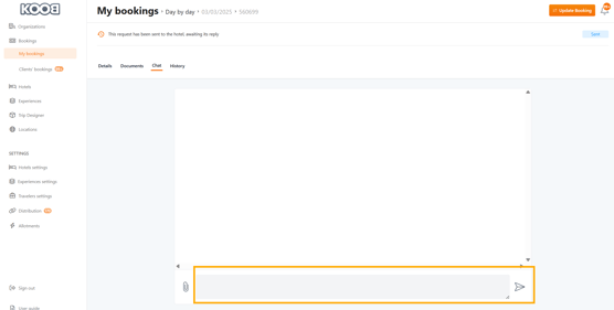 ✅ KOOB sends email notifications, and you can check the Chat tab in the booking details.