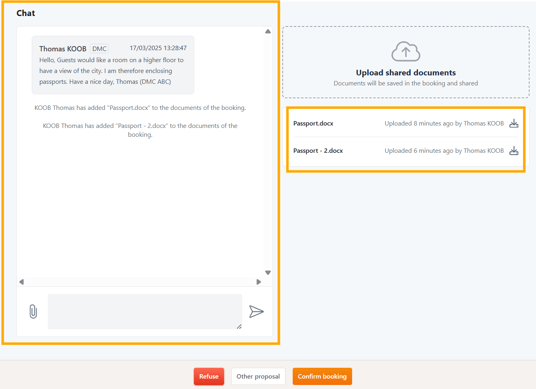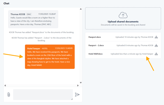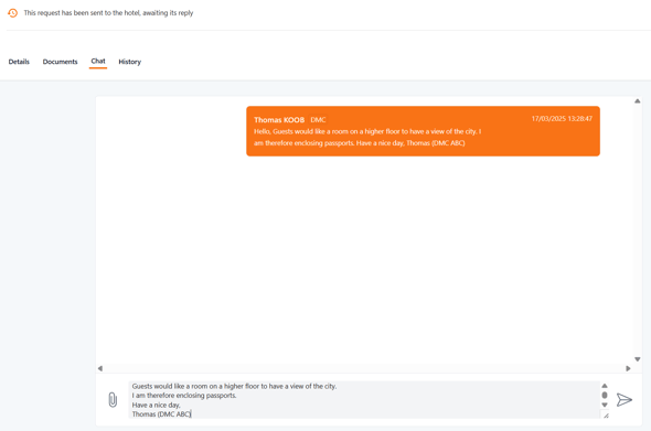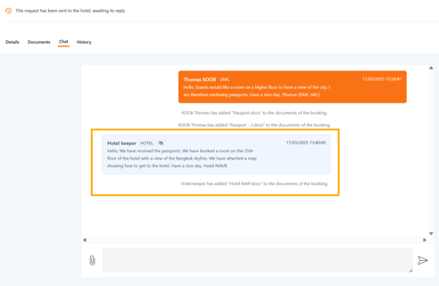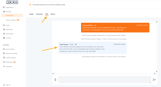 KOOB provides an integrated messaging and document-sharing system that allows DMCs to communicate directly with hotels regarding reservations. This feature enables seamless communication for booking confirmations, modifications, counter-proposals, and special requests.