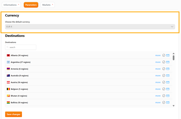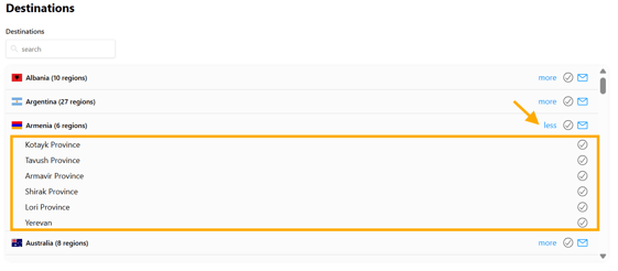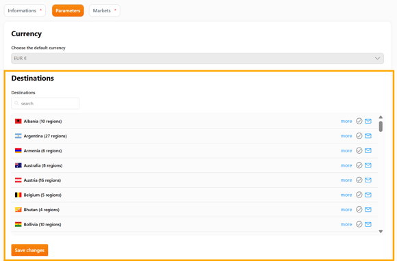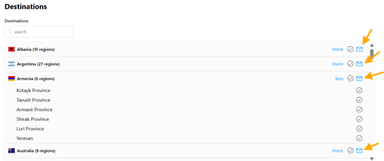 - Reach “Destinations” to select countries where you operate. You can use the search to save time.