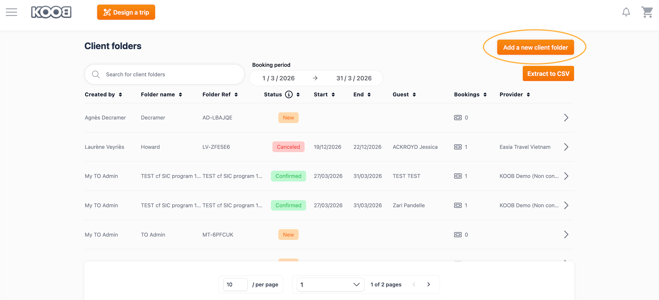 Managing client folders efficiently is key to organizing bookings, tracking modifications, and ensuring smooth trip management. A client folder in KOOB centralizes all Trips, Drafts, Bookings, Hotels, and Experiences related to a specific client.