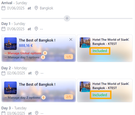 📅 Day-specific options Applied to a specific day (e.g., massage on Day 3, cooking class on Day 4)