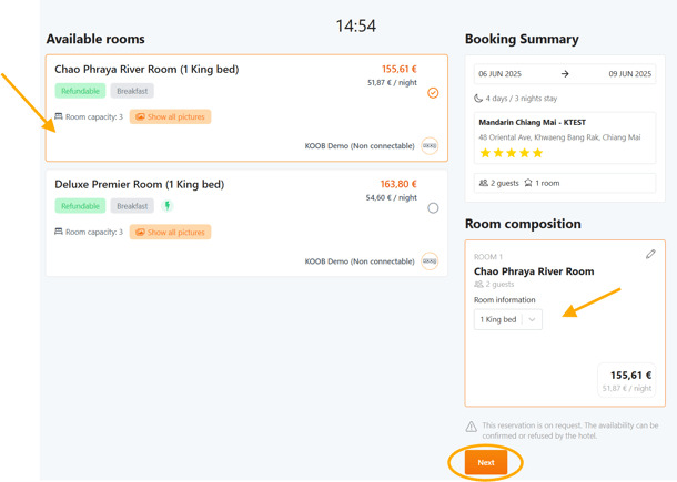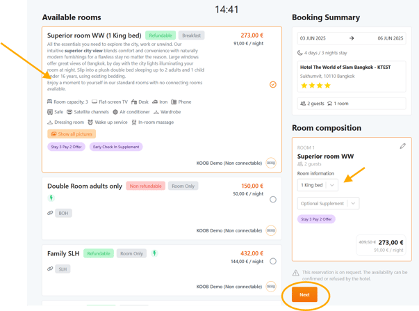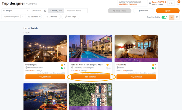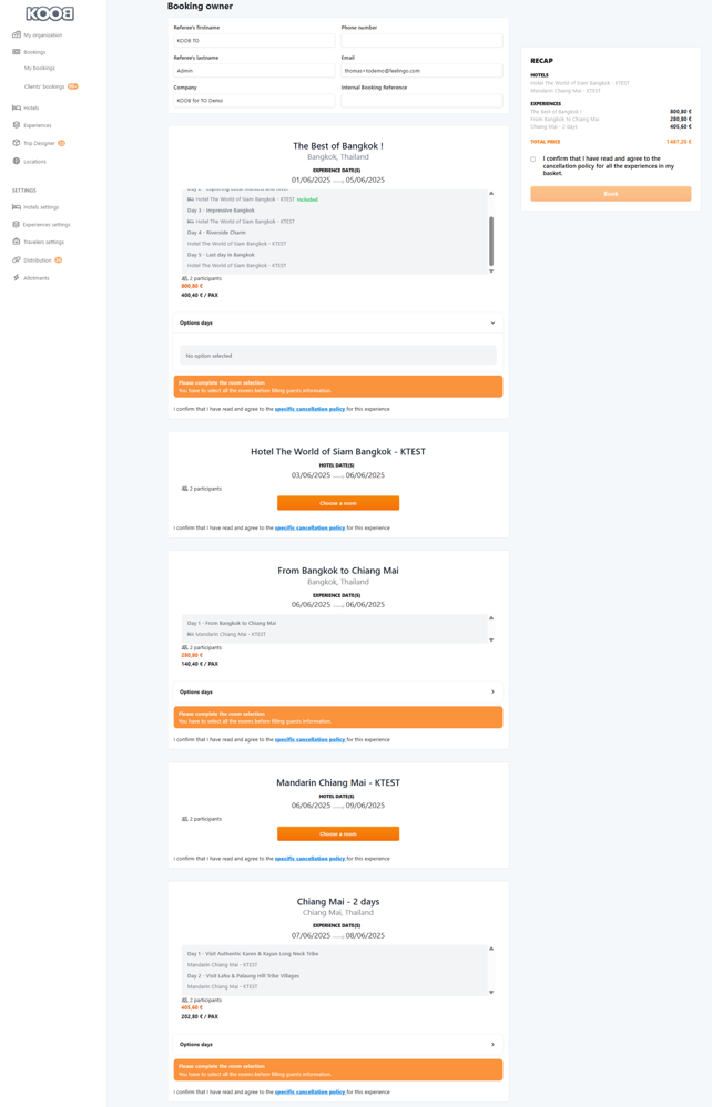 • Below each hotel module (e.g., Hotel The World of Siam Bangkok or Mandarin Chiang Mai), KOOB prompts you to: