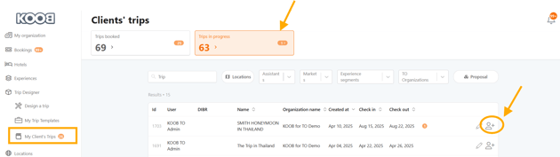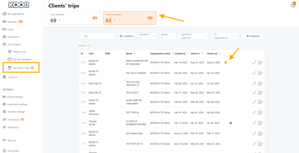 The trip is also visible in Trip Designer > Clients' Trips > Trips in Progress, marked with a notification icon.