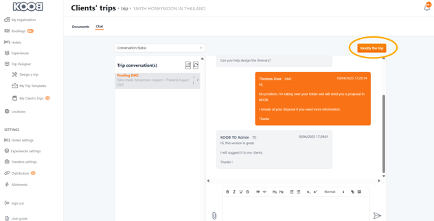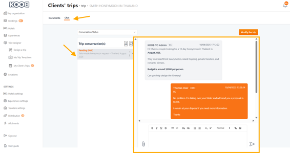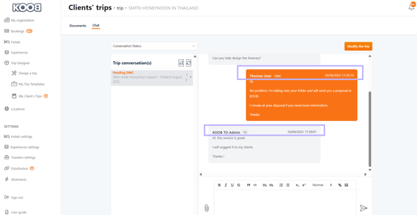 KOOB provides a topic-based chat system to structure all exchanges between the DMC and TO.