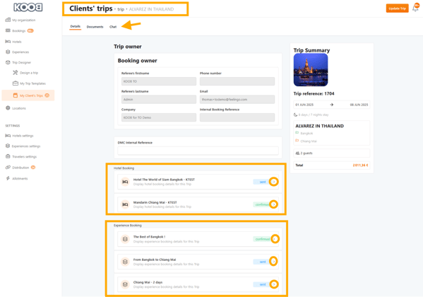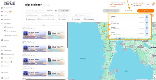 KOOB’s Co-Construction feature enables DMCs to collaborate with Tour Operators (TOs) directly inside the Trip Designer. When a TO needs support during itinerary creation or modification, they can request assistance through KOOB’s integrated messaging system. As a DMC, you can respond to their needs, modify trips in real time, and share documents — all in one place.