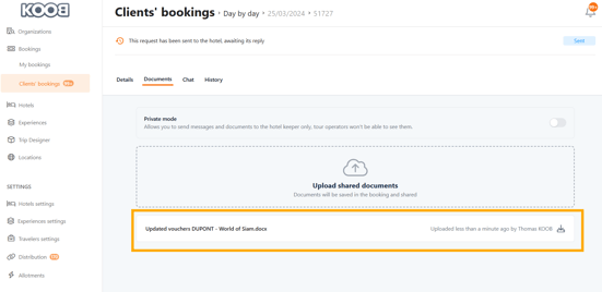 📌 Tip: TOs can also upload files, such as passports, special requests, or updated itineraries. Add a relevant name on the file (e.g. “Updated voucher DUPONT” or “Guest list REF12456”)