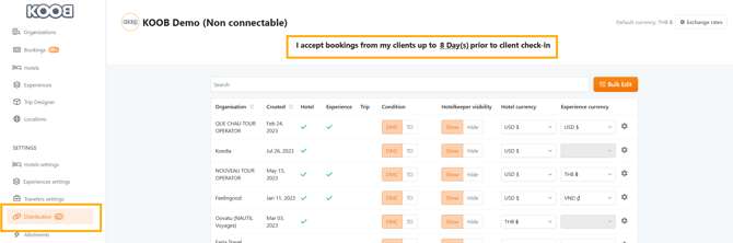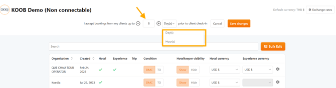 KOOB allows DMCs to set last-minute booking restrictions, preventing Tour Operators (TOs) from making reservations too close to check-in for hotels or the start date for experiences. This ensures that DMCs and suppliers have enough time to confirm availability and prepare for guest arrivals.
