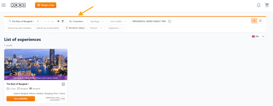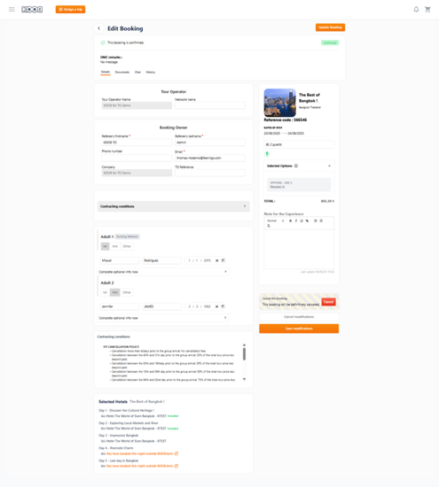 KOOB enables Tour Operators (TOs) to efficiently modify or cancel existing experience bookings. Easily adjust traveler numbers, hotel selections, or cancel reservations entirely—KOOB’s intuitive platform ensures smooth, transparent coordination with DMCs.