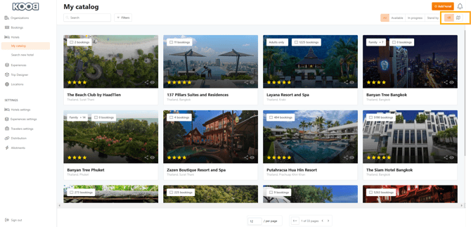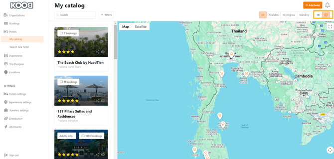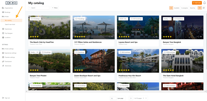 The Hotel Catalog in KOOB serves as the main interface where DMCs can view, filter, and manage their hotels. This catalog allows you to: