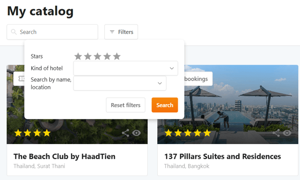 To find specific hotels, use the dynamic search bar at the top of the catalog. You can search by: