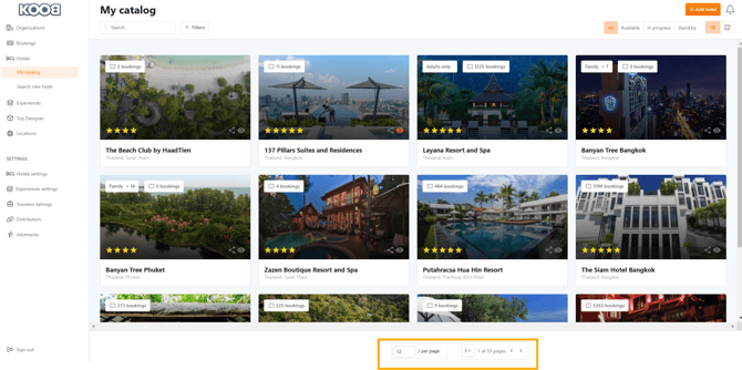 When navigating the Hotel Catalog in KOOB, you will notice controls that allow you to adjust the number of hotels displayed per page and navigate through multiple pages of results.
