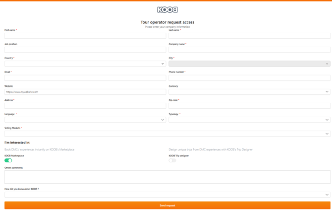 To start using KOOB, Tour Operators (TOs) need to create an account and submit a request for validation. This ensures that only verified businesses can connect with DMCs, hotels, and experience providers on the KOOB marketplace.