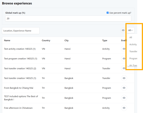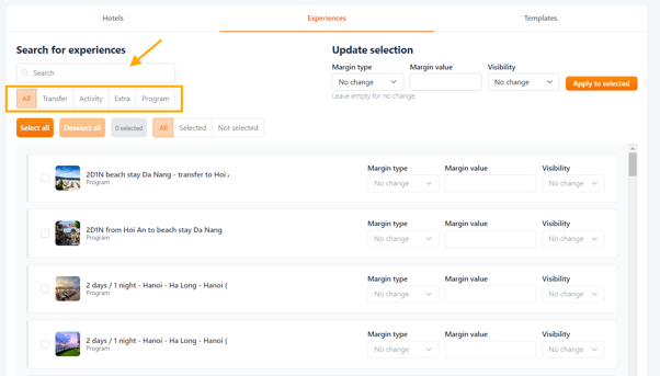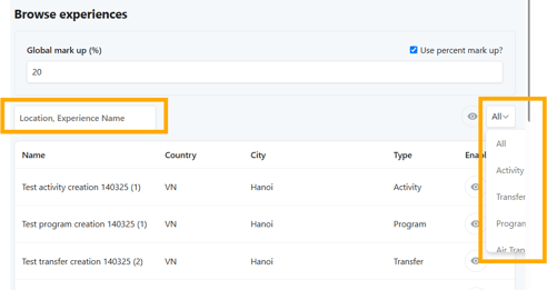 • Filter Experiences by name or typology (e.g., Transfer, Activity, Extra, Program).