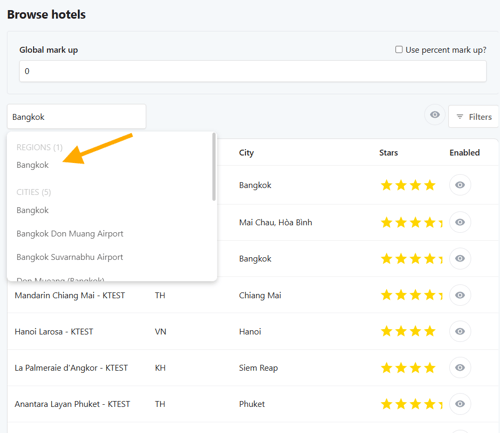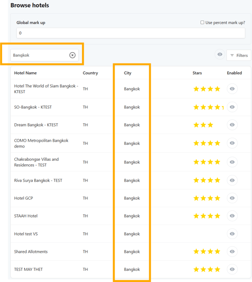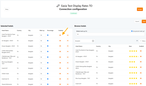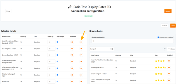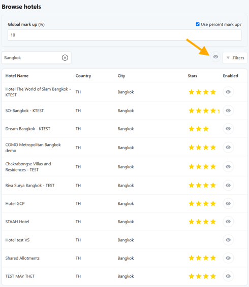 • Click the Eye Icon πŸ‘ to move hotels between visible (distributed) and hidden (not bookable).