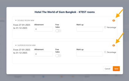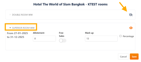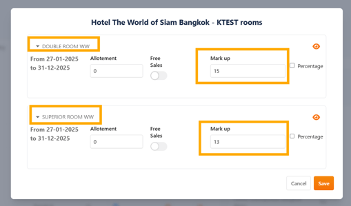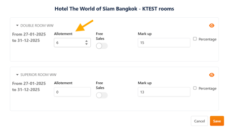 βœ… Assign allotments, free sales, and define markups on specific products or room types.