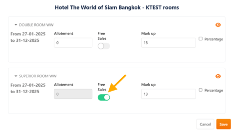 • If a stop-sale is applied by the hotel, disable Free Sales and set allotments to "0" to restrict TO bookings.