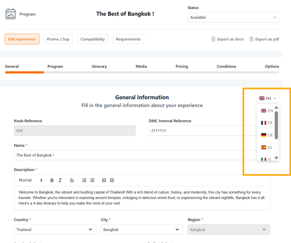 Translating your experiences into multiple languages is key to making them accessible, understandable, and marketable for Tour Operators (TOs) worldwide. KOOB’s translation tools allow you to localize your product content without duplicating efforts, while maintaining a unified structure.