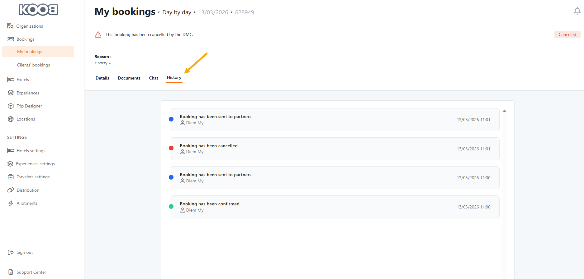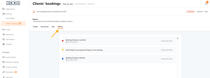 Every modification or update made to a booking is recorded in the History tab of the booking details.