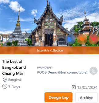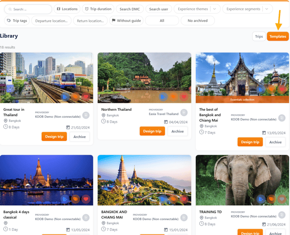 πΌ Trip image π·οΈ Trip name π Destination city π Duration in days π Last update π§ Provider name (DMC) π Blue icon β Preview the full trip content before using it π "Design trip" button β Open the template and customize it |
