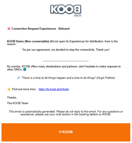 📧 Email Subject:[KOOB] Your connection request to [DMC Name] has been declined.
