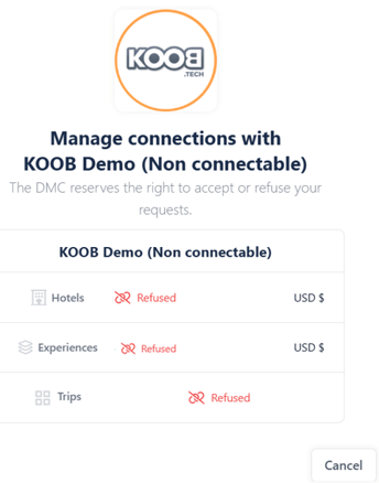 When you request a connection to a DMC in KOOB, they can choose to accept or decline your request. If declined, you cannot access or book their Hotels, Experiences, or Trips—though you can still see their Showcase products.