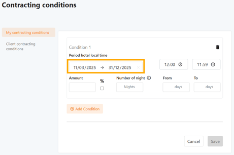 Cancellation and contracting conditions are managed in the "Contracting Conditions" tab within a hotel contract.