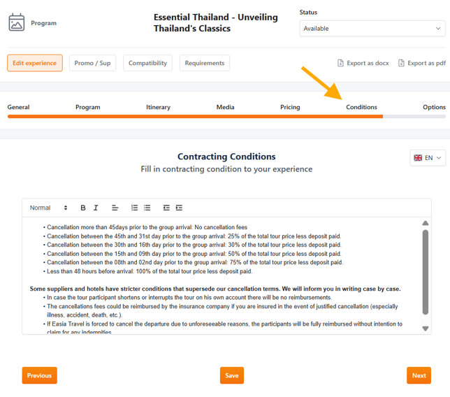 • Client Contracting Conditions → Defines the DMC’s cancellation policy for TOs.
