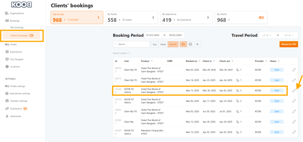 • Find the Hotel or Experience Booking using filters (Booking ID, TO Name, Date, etc.).